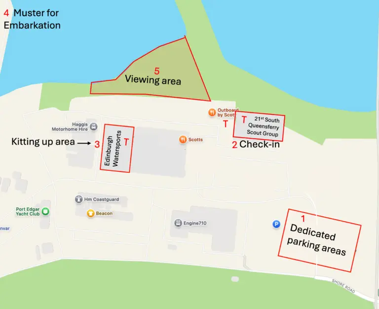 You will find Port Edgar Marina a fascinating location for your day as a rafter in The Forth Bridges Raft Race. You will be very welcome to spend as much time as you like exploring the site, with unparalleled views of the river Forth, the road bridges, the historic infrastructure and access to top-class amenities for marine enthusiasts, boat owners and visitors. Below you will find a map showing the key locations you will need to attend as a rafter. These are numbered in the order in which rafters will need to visit them during your day.